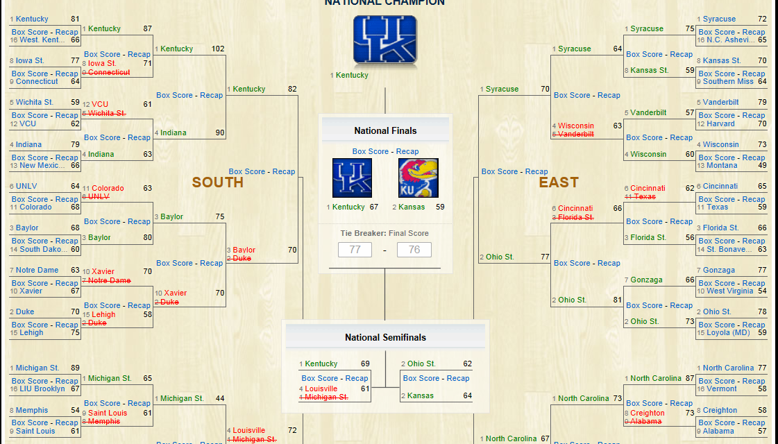 Well congratulations to Kentucky for winning their 8th national championship in basketball. How did you do, our your brackets this year? Did you enter into any contests or competitions with friends? A few of the other youth pastors and I had a group and had a good time talking smack to each other. This year I picked 41 out of 63 possible games, had 3 of the final 4 teams in my bracket and picked Kentucky to win it all. Pretty stupid considering that I didn’t watch a single college basketball came all season.